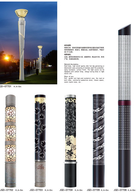 景觀燈分類:城市標志性景觀燈、仿古景觀燈、鏤空現代景觀燈、不銹鋼景觀燈、藝術造型景觀燈等